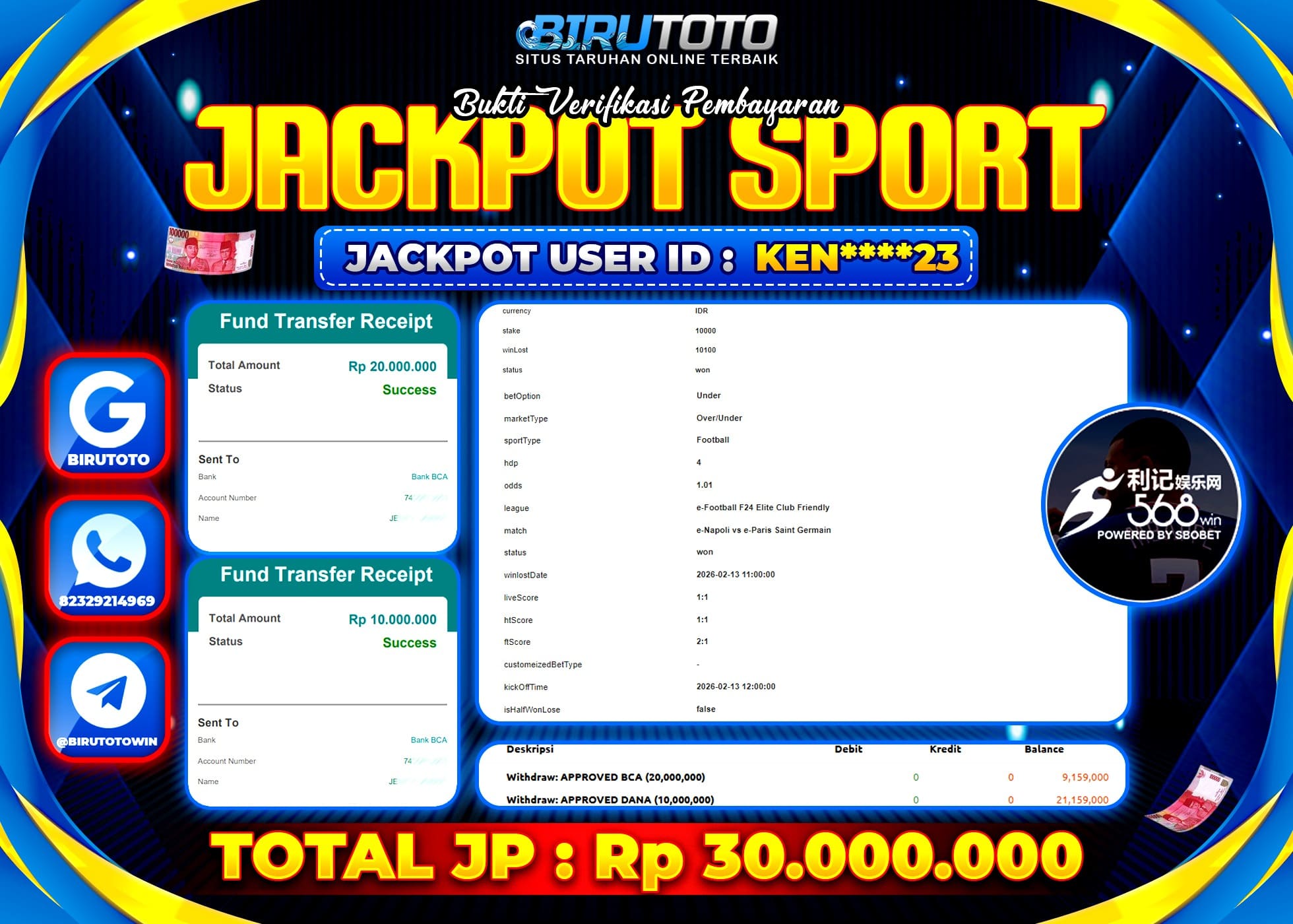 BIRUTOTO JACKPOT SBO SPORTS Rp.30.000.000 LUNAS