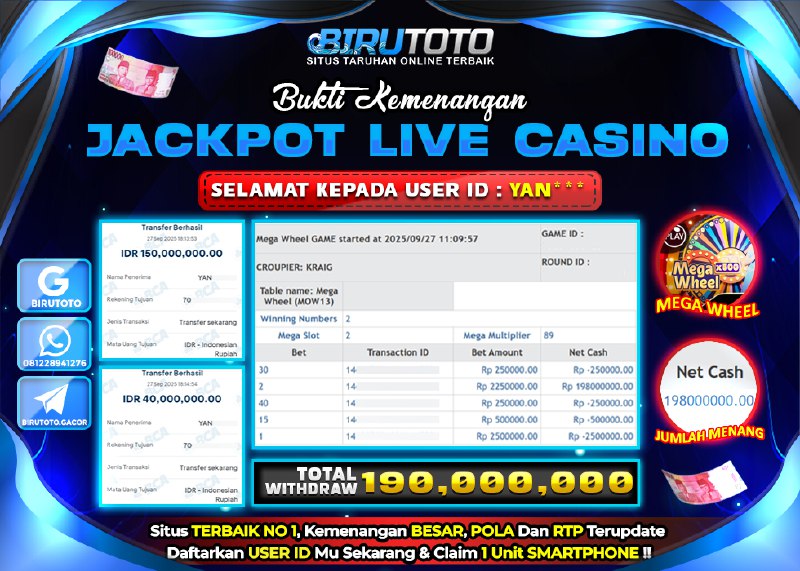 BIRUTOTO JACKPOT LIVE CASINO MEGA WHEEL Rp.190.000.000 LUNAS