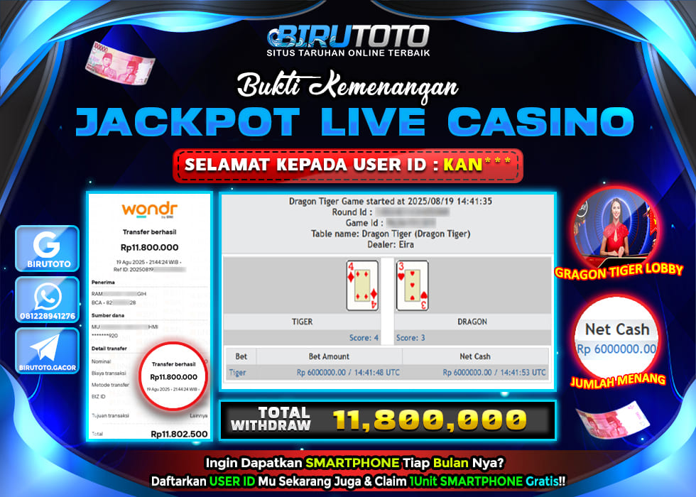 BIRUTOTO JACKPOT LIVE CASINO GRAGON TIGER LOBBY Rp.11.800.000 LUNAS