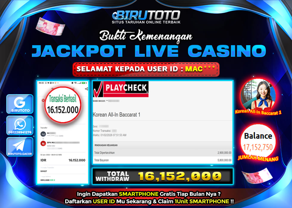 BIRUTOTO JACKPOT LIVE CASINO KOREAN ALL-IN BACCARAT Rp.16.152.000 LUNAS