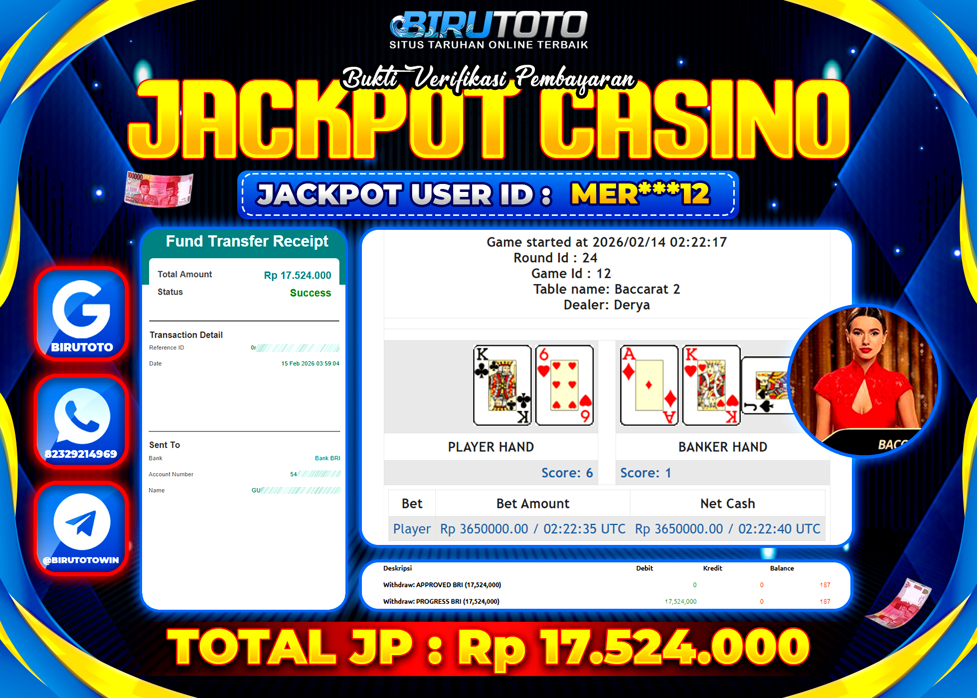 BIRUTOTO JACKPOT LIVE CASINO BACCARAT Rp.17.524.000 LUNAS