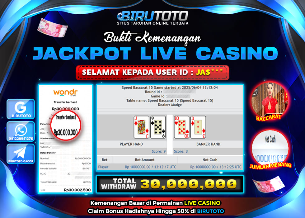 BIRUTOTO JACKPOT LIVE CASINO BACCARAT Rp.30.000.000 LUNAS