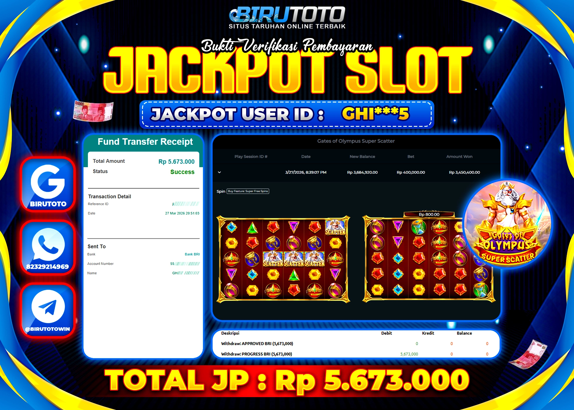 Selamat Kepada Member BIRUTOTO HE**** Telah Jackpot Di SLOT GATES OF GATOT KACA SUPER SCATTER