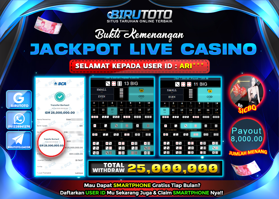 BIRUTOTO JACKPOT LIVE CASINO SICBO Rp.25.000.000 LUNAS