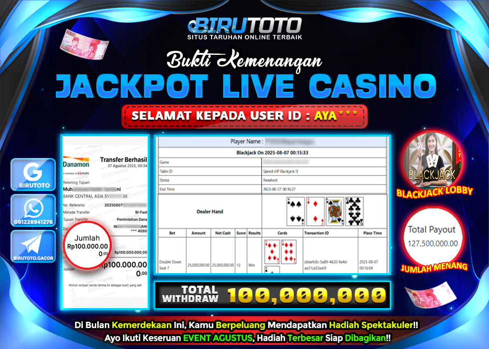 BIRUTOTO JACKPOT LIVE CASINO BLACKJACK LOBBY Rp.100.000.000 LUNAS
