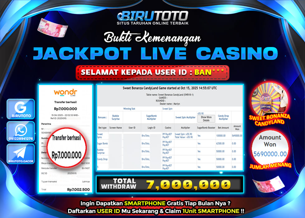 BIRUTOTO JACKPOT LIVE CASINO SWEET BONANZA CANDYLAND Rp.7.000.000 LUNAS