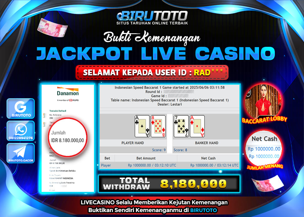 BIRUTOTO JACKPOT LIVE CASINO BACCARAT Rp.8.180.000 LUNAS
