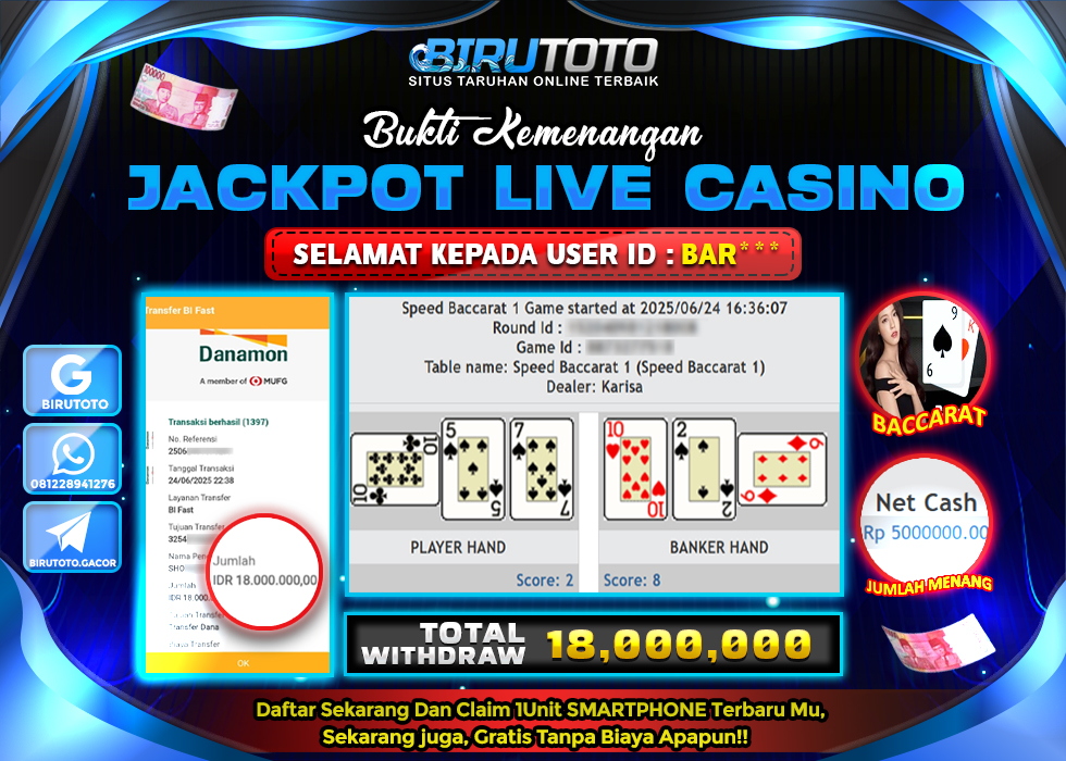 BIRUTOTO JACKPOT LIVE CASINO BACCARAT Rp.18.000.000 LUNAS