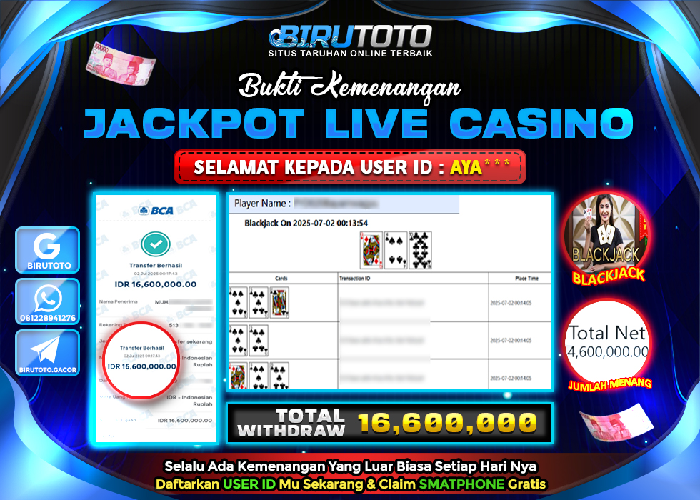 BIRUTOTO JACKPOT LIVE CASINO BLACKJACK LOBBY Rp.16.600.000 LUNAS