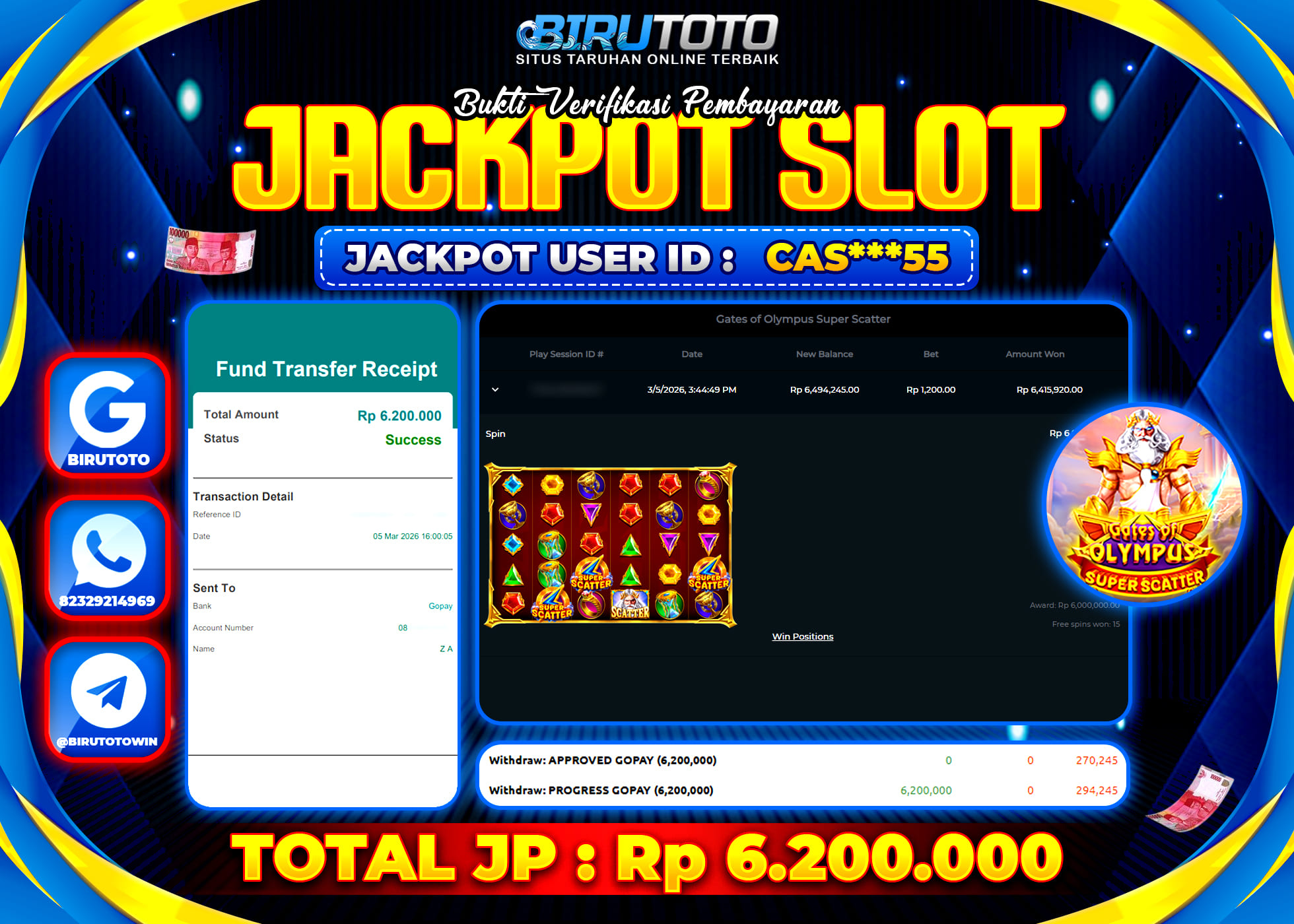 Selamat Kepada Member BIRUTOTO CAS***55 Telah Jackpot Di SLOT GATES OF OLYMPUS SUPER SCATTER