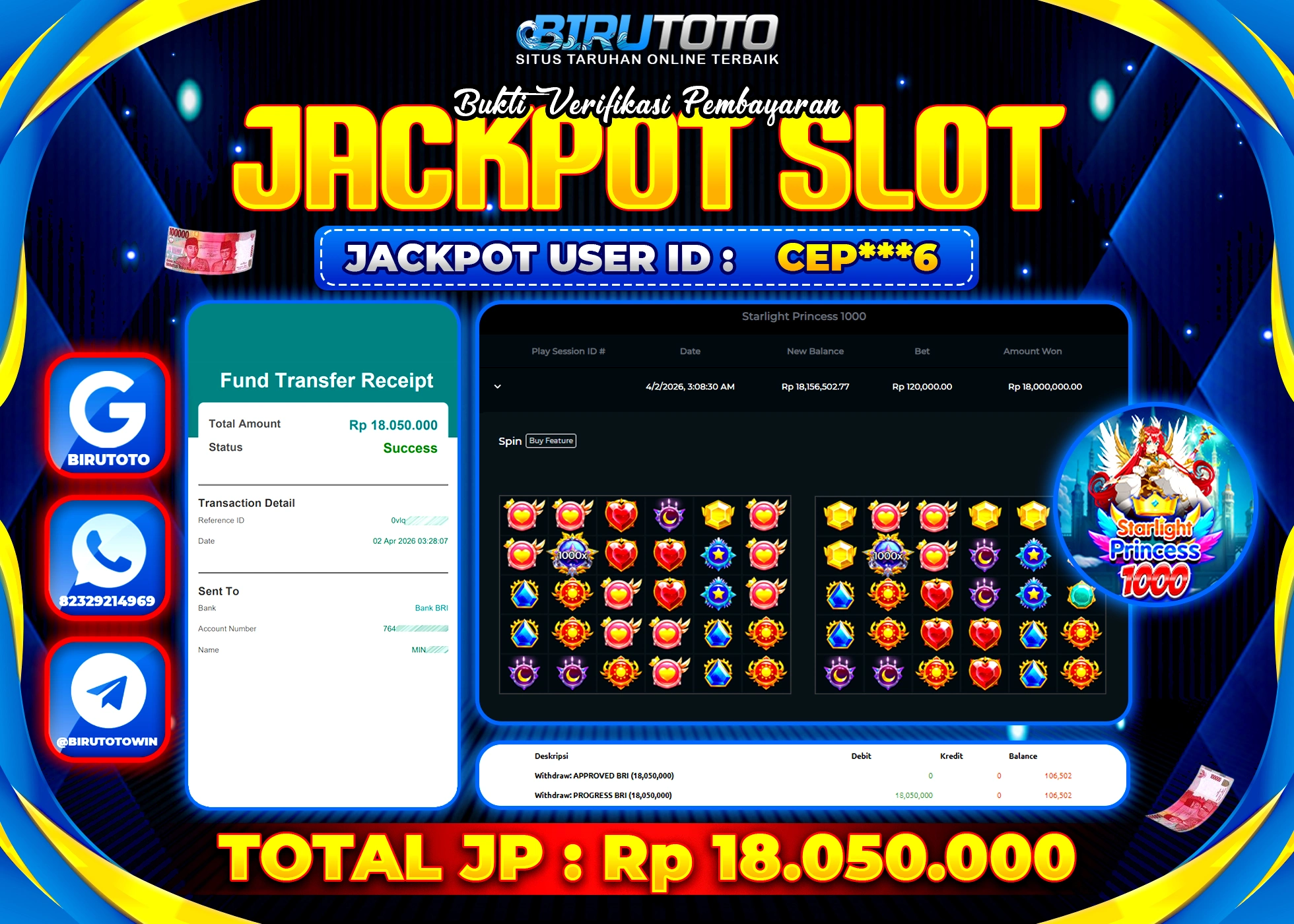 BIRUTOTO JACKPOT SLOT STARLIGHT PRINCES 1000 Rp.18.050.000 LUNAS