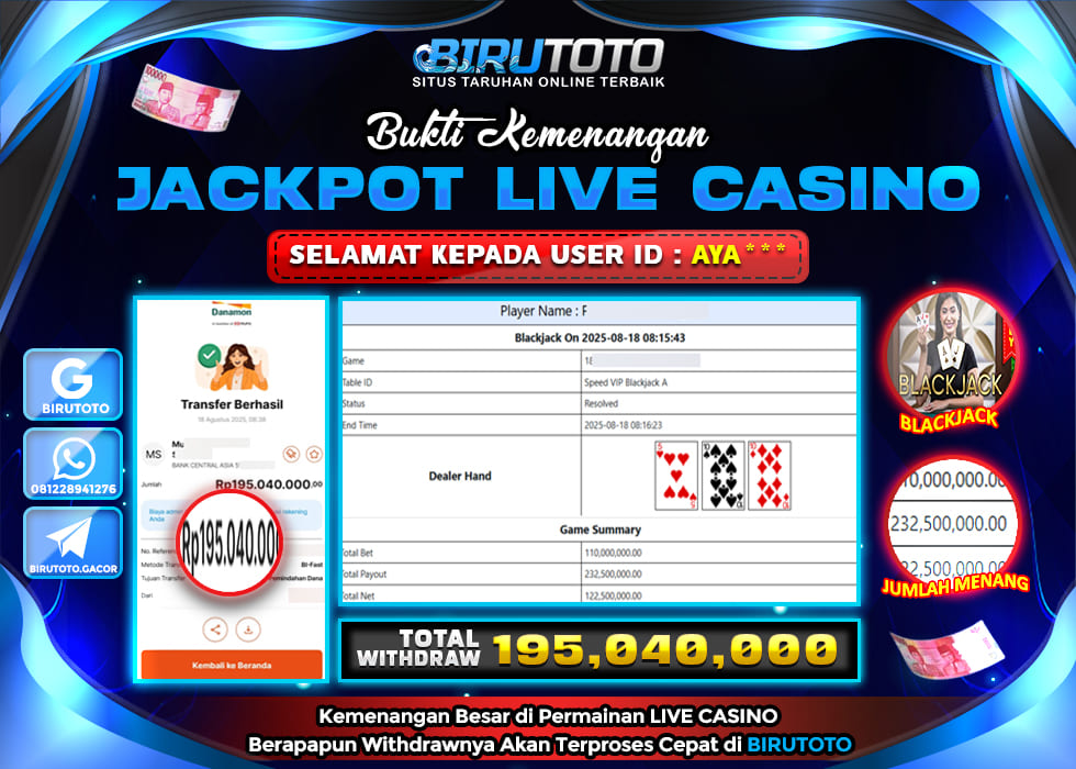 BIRUTOTO JACKPOT LIVE CASINO BLACKJACK LOBBY Rp.195.040.000 LUNAS