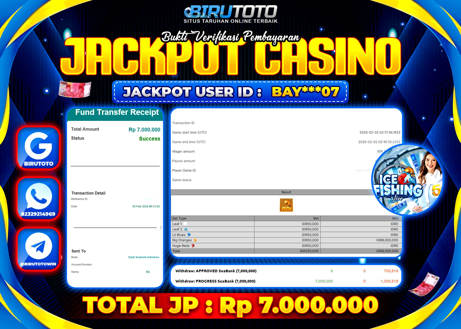 BIRUTOTO JACKPOT LIVE CASINO ICE FISHING Rp.7.000.000 LUNAS