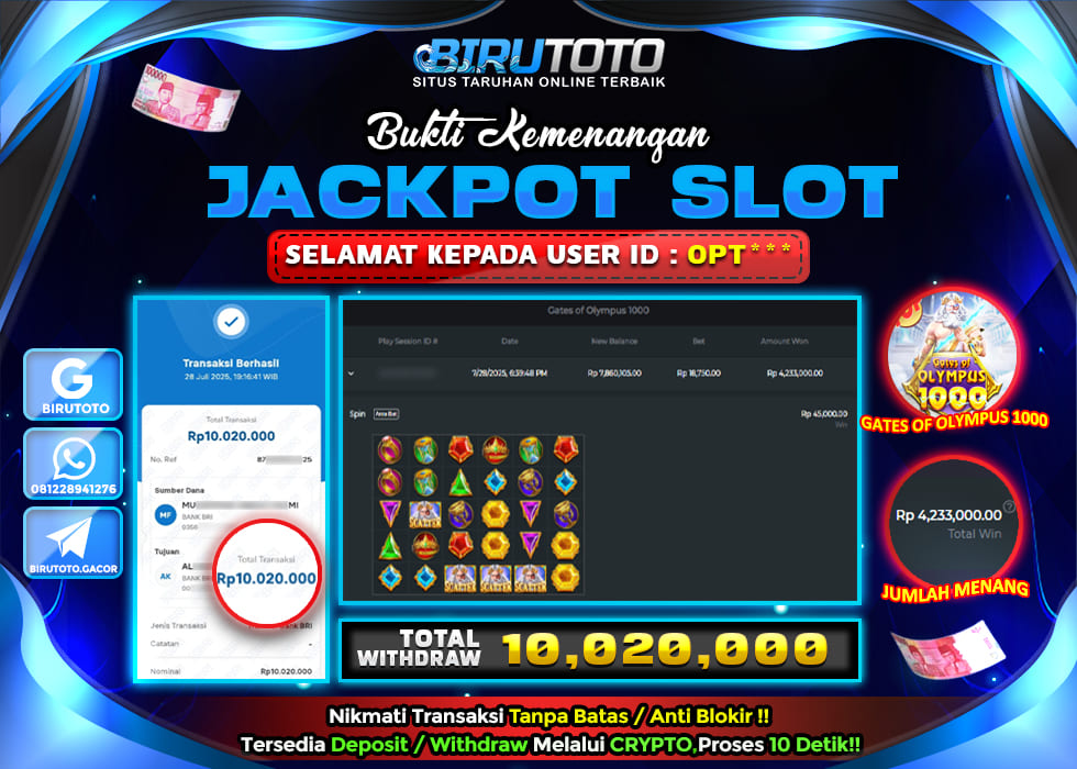 Selamat Kepada Member BIRUTOTO OP**** Telah Jackpot Di SLOT GATES OF OLYMPUS 1000
