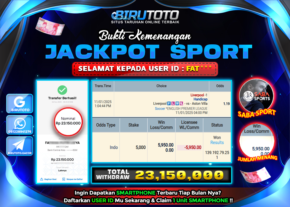 BIRUTOTO JACKPOT SPORT SABA SPORTS Rp.23.150.000 LUNAS