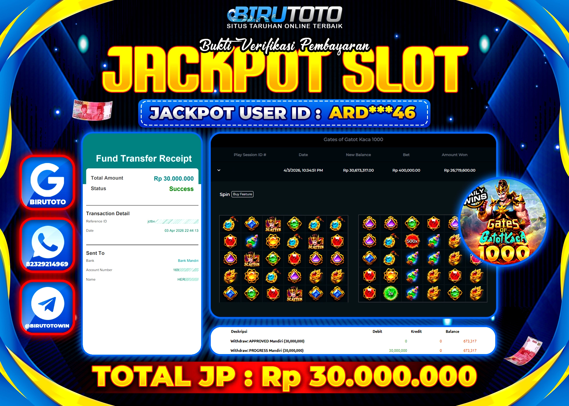 BIRUTOTO JACKPOT SLOT GATES OF GATOT KACA 1000 Rp.30.000.000 LUNAS
