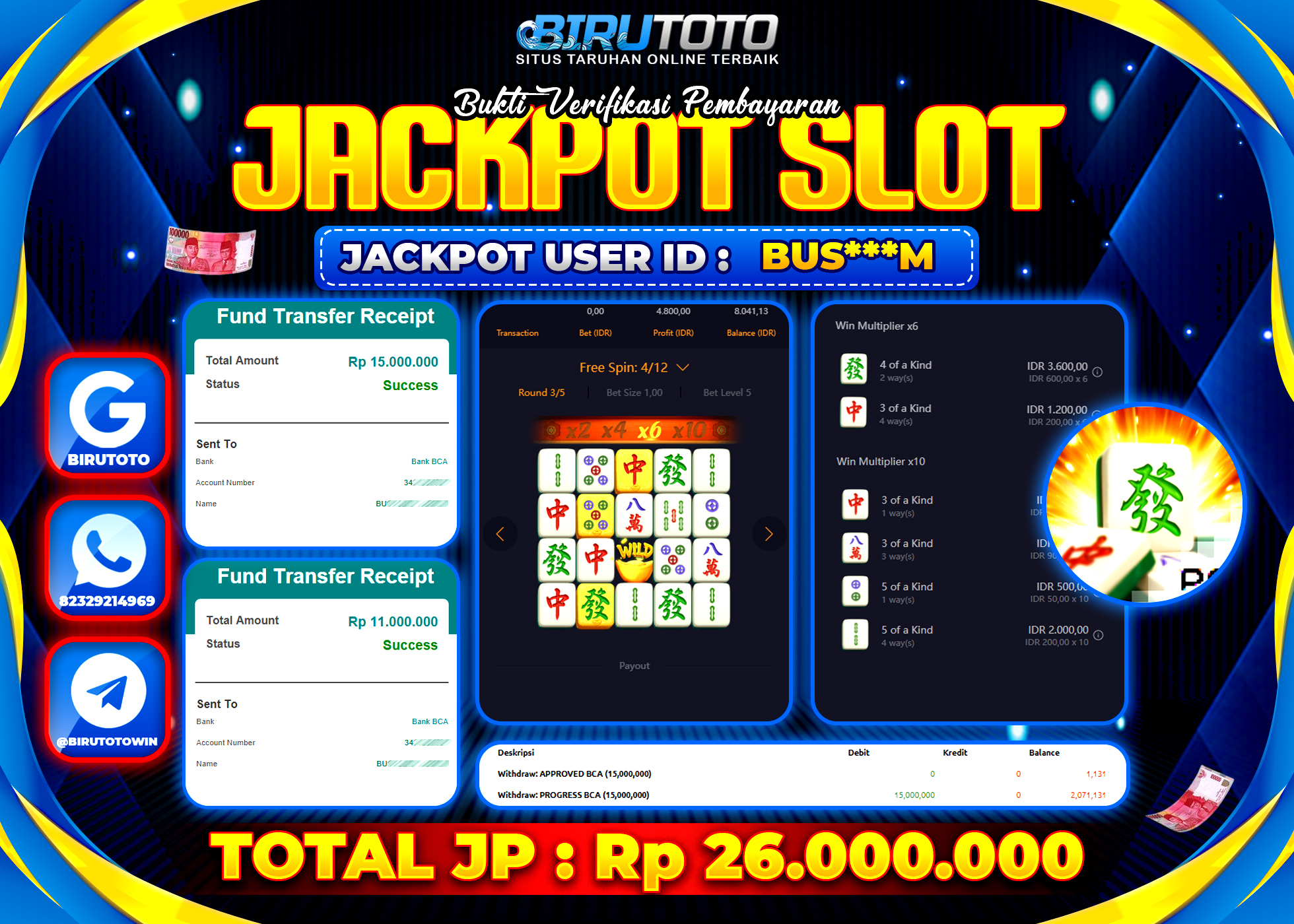 Selamat Kepada Member BIRUTOTO BUS***M Telah Jackpot Di SLOT MAHJONG WAYS