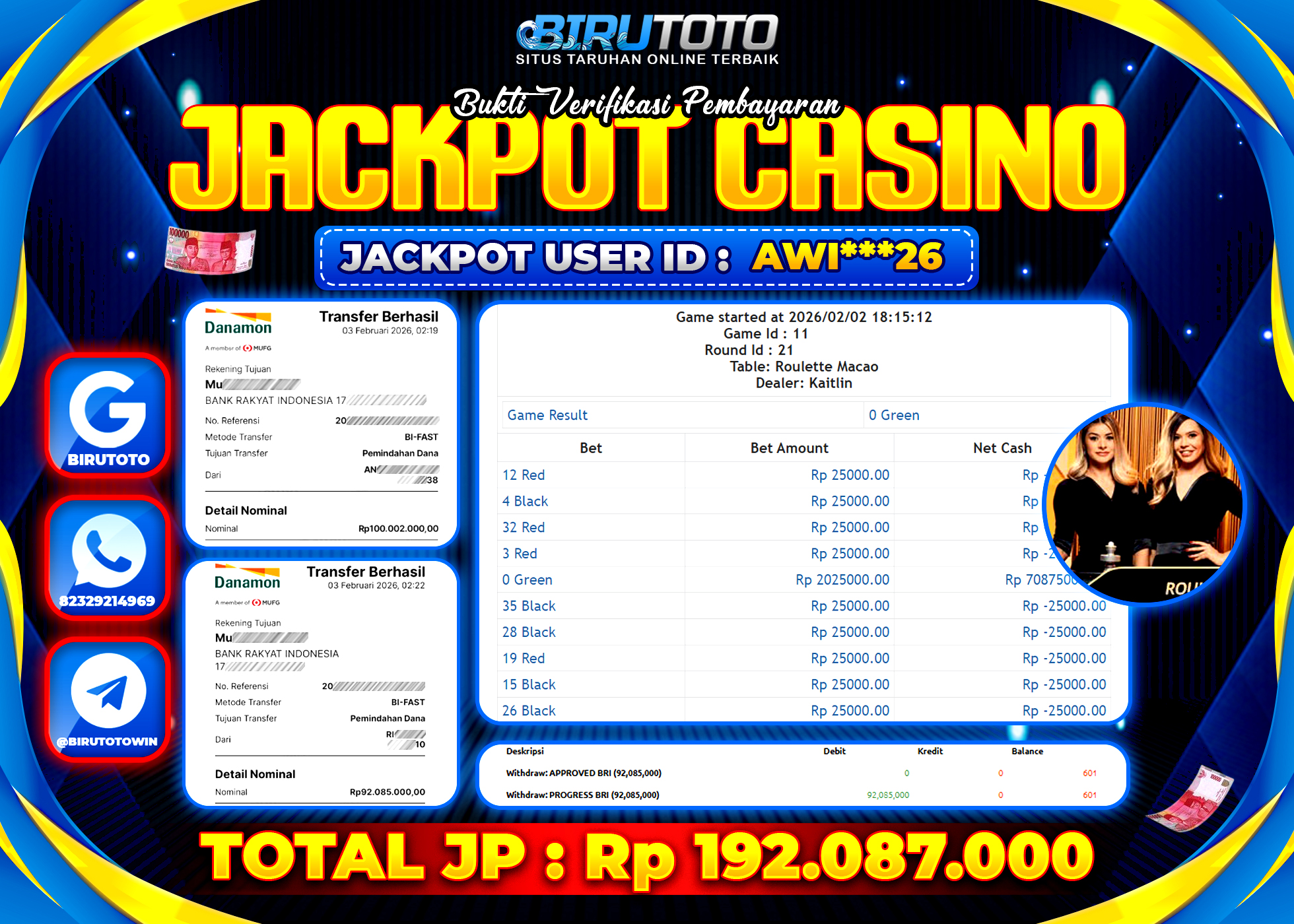 BIRUTOTO JACKPOT LIVE CASINO ROULETTE Rp.192.087.000 LUNAS