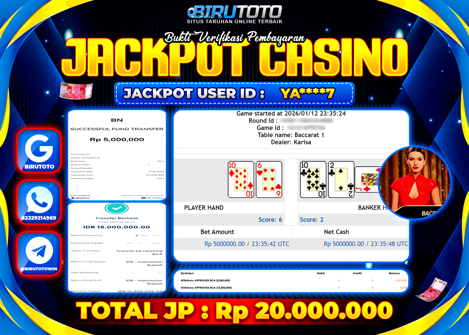 BIRUTOTO JACKPOT LIVE CASINO BACCARAT CLASSIC Rp.20.000.000 LUNAS