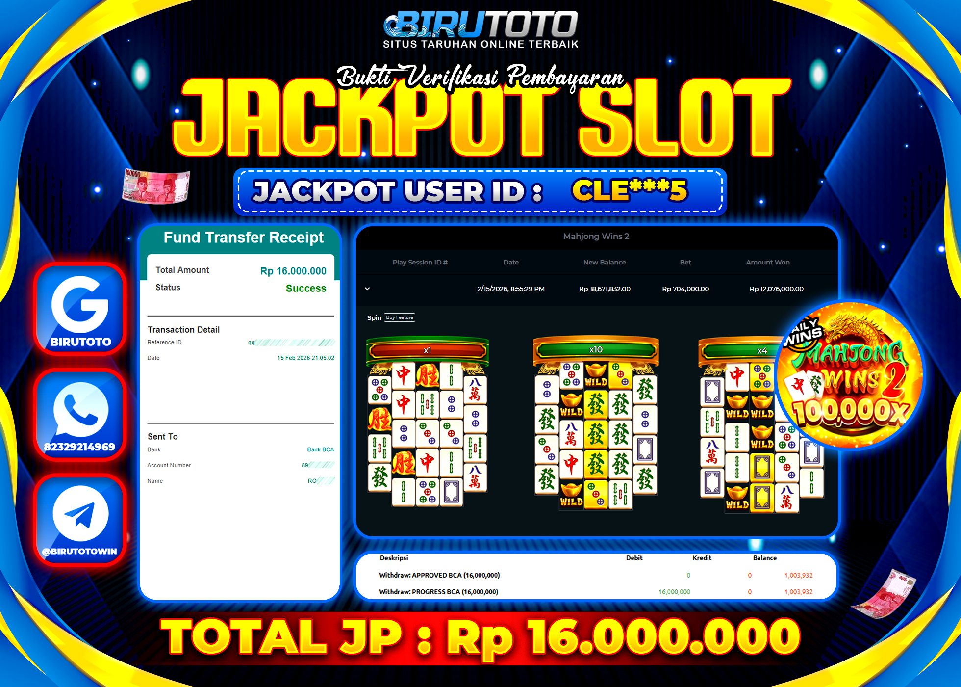BIRUTOTO JACKPOT SLOT MAHJONG WINS 2 Rp.16.000.000 LUNAS