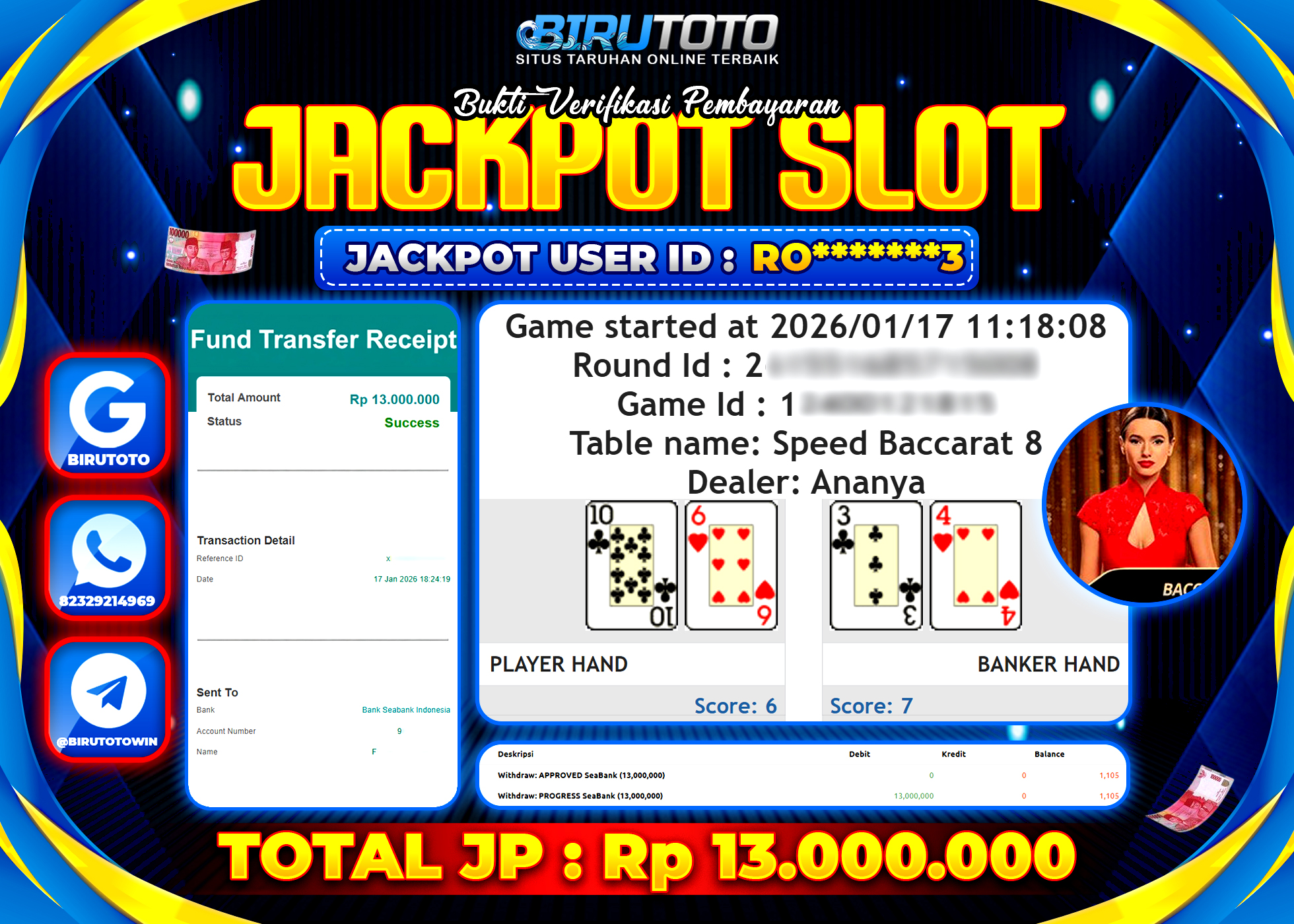 BIRUTOTO JACKPOT LIVE CASINO SPEED BACCARAT Rp.13.000.000 LUNAS