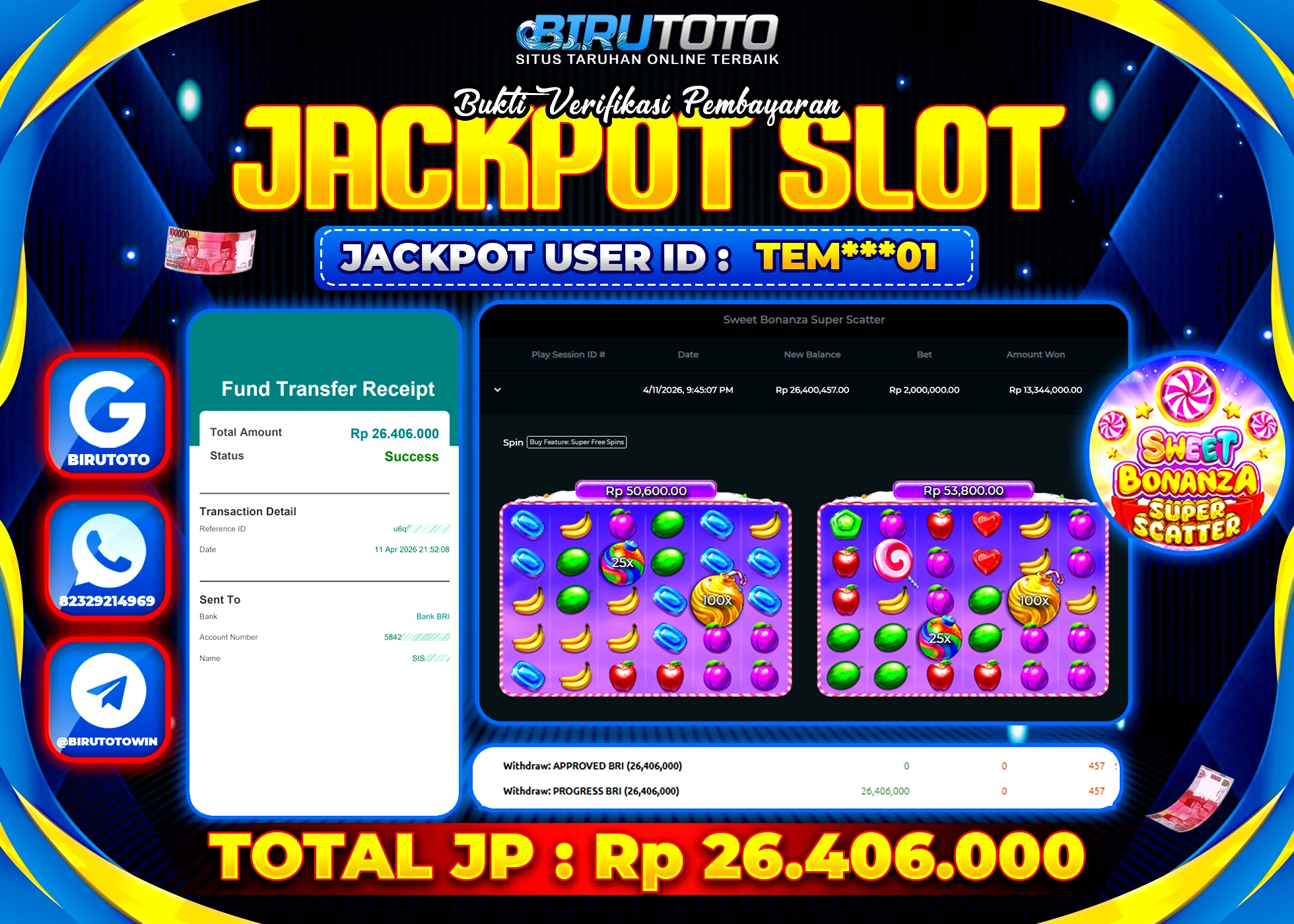 BIRUTOTO JACKPOT SLOT SWEET BONANZA SUPER SCATTER Rp.26.406.000 LUNAS