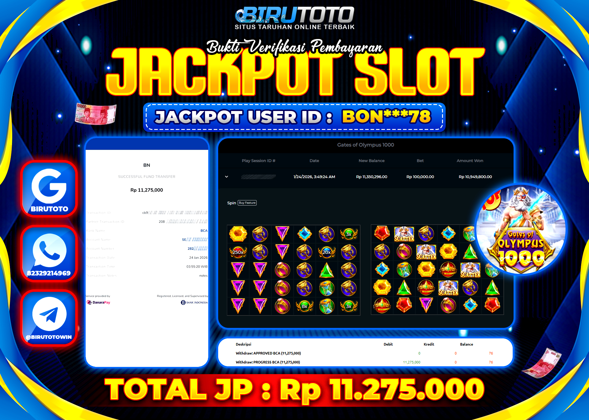 BIRUTOTO JACKPOT SLOT GATES OF OLYMPUS 1000 Rp.11.275.000 LUNAS