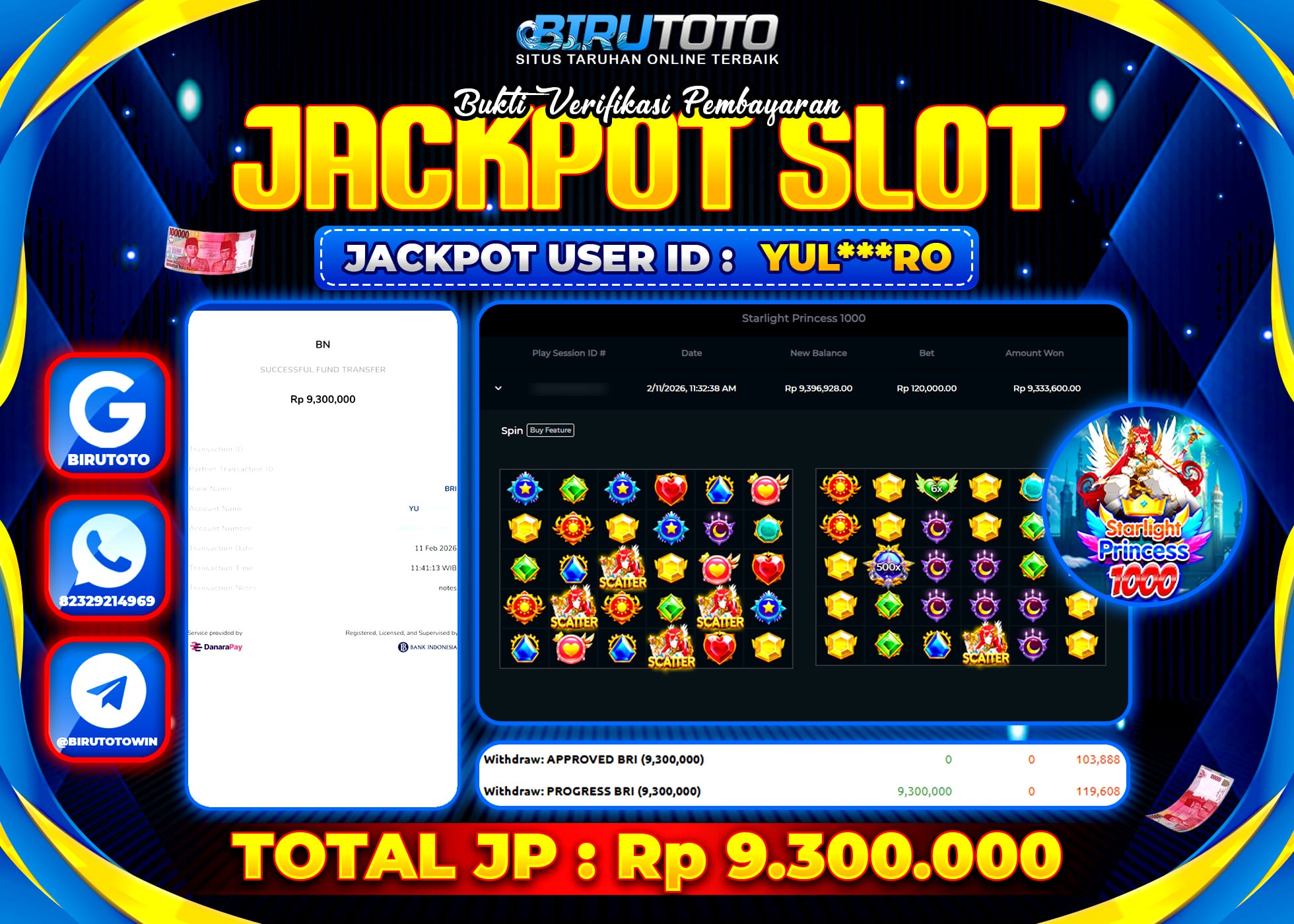 BIRUTOTO JACKPOT SLOT STARLIGHT PRINCESS 1000 Rp.9.300.000 LUNAS