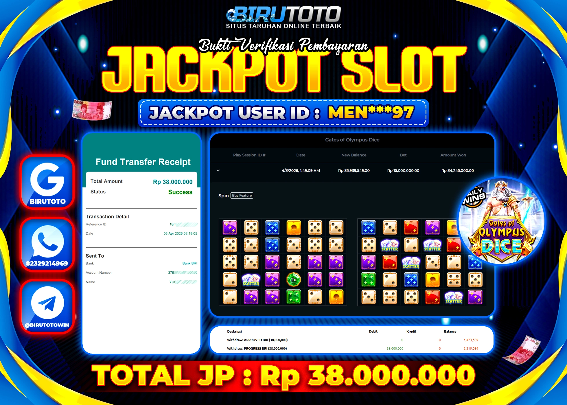 BIRUTOTO JACKPOT SLOT GATES OF OLYMPUS DICE Rp.38.000.000 LUNAS