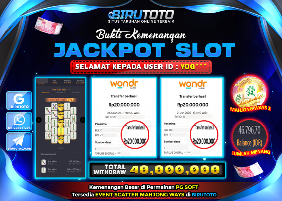 Ya cuma di BIRUTOTO, tempat paling aman dan terpercaya buat pecinta SLOT MAHJONG WINS 2. Nikmati layanan premium, kemenangan fantastis, dan pembayaran tanpa drama.