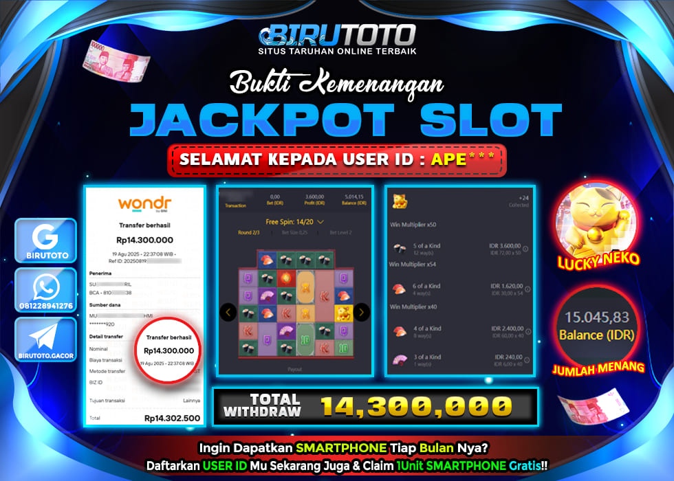 BIRUTOTO JACKPOT SLOT LUCKY NEKO Rp.14.300.000 LUNAS