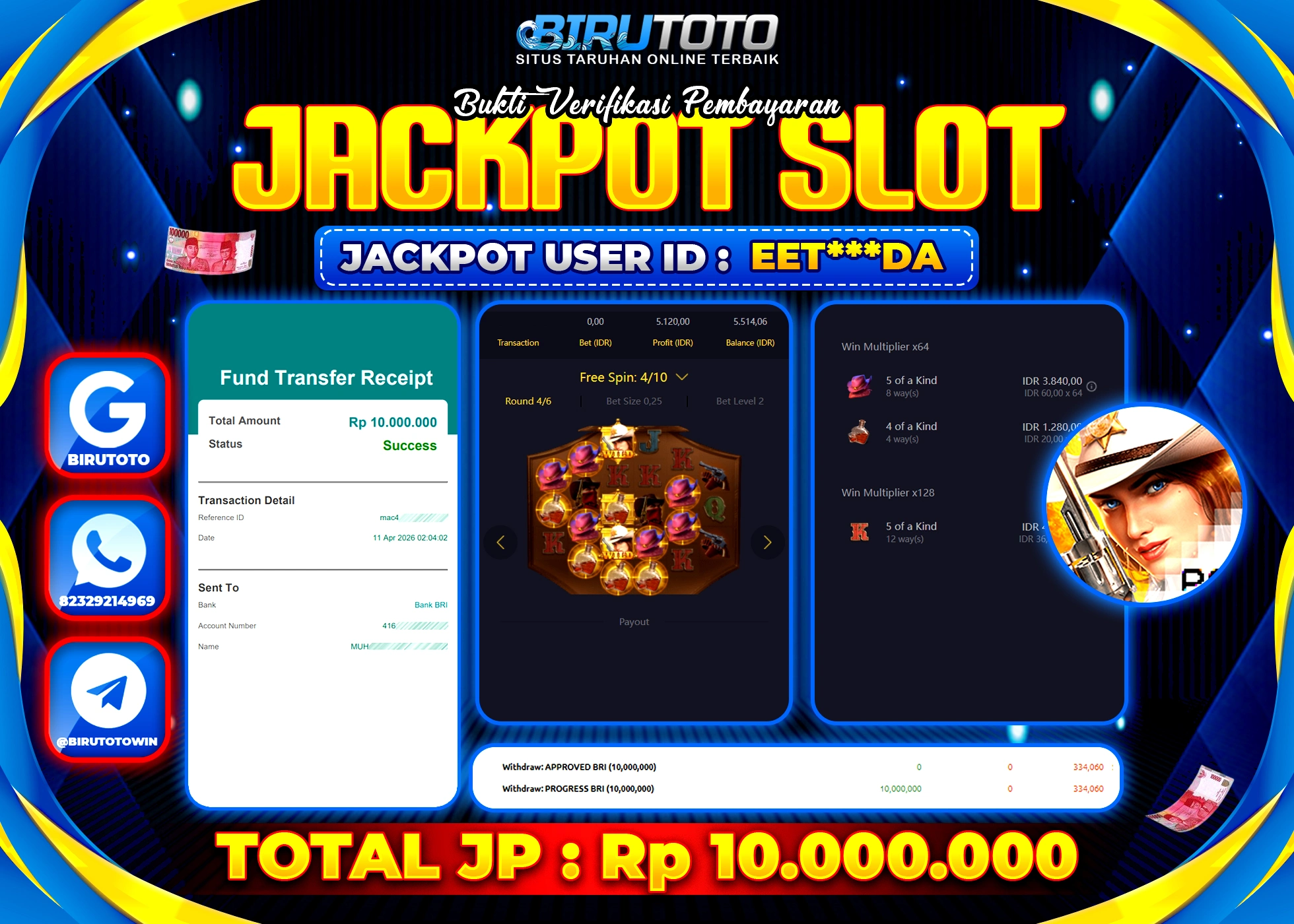 Selamat Kepada Member BIRUTOTO EET***DA Telah Jackpot Di SLOT WILD BOUNTY SHOWDOWN