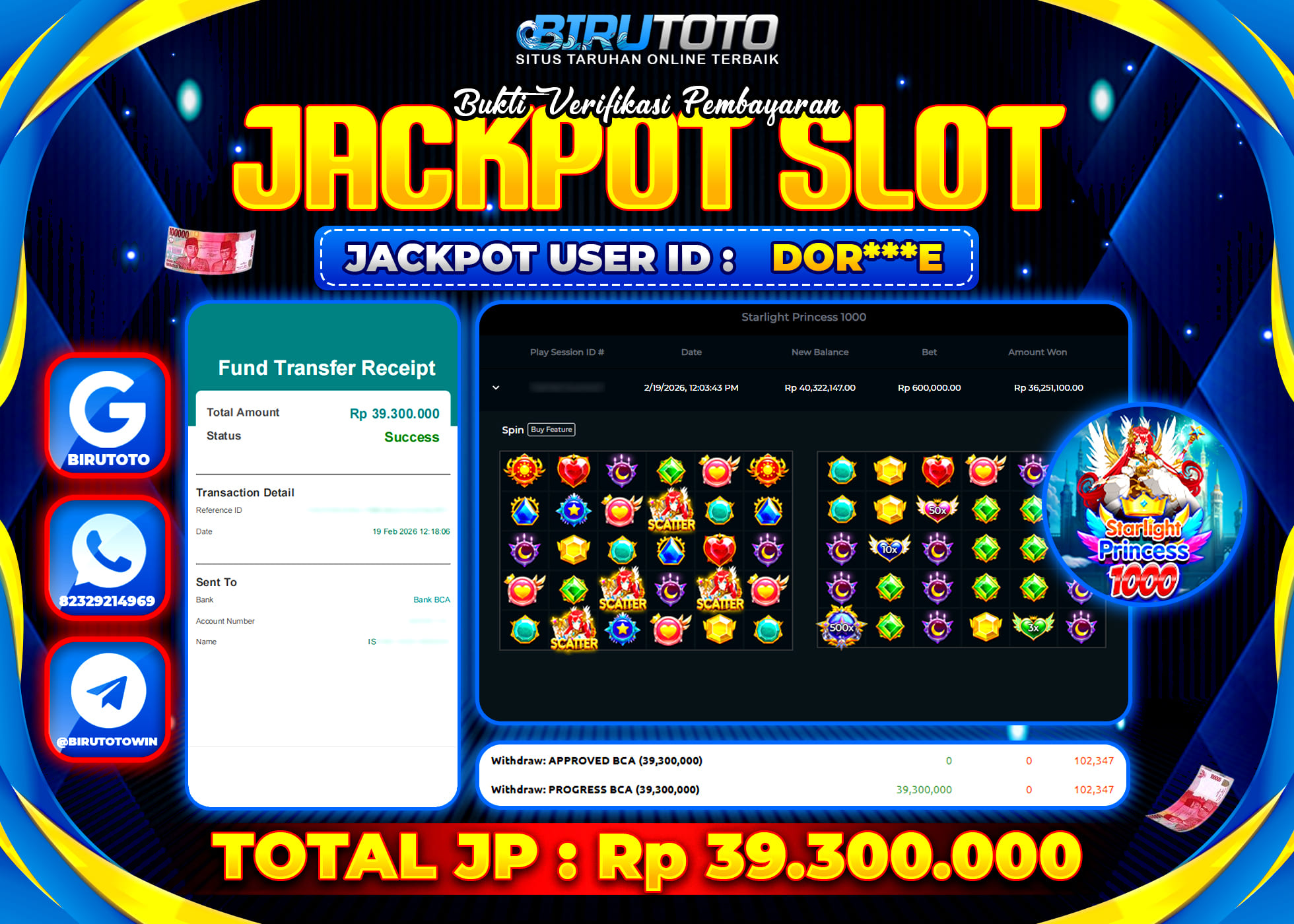 BIRUTOTO JACKPOT SLOT STARLIGHT PRINCES 1000 Rp.39.300.000 LUNAS
