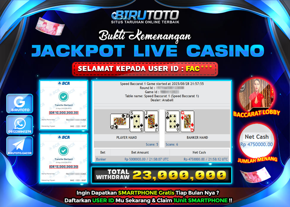 BIRUTOTO JACKPOT LIVE CASINO BACCARAT LOBBY Rp.23.000.000 LUNAS