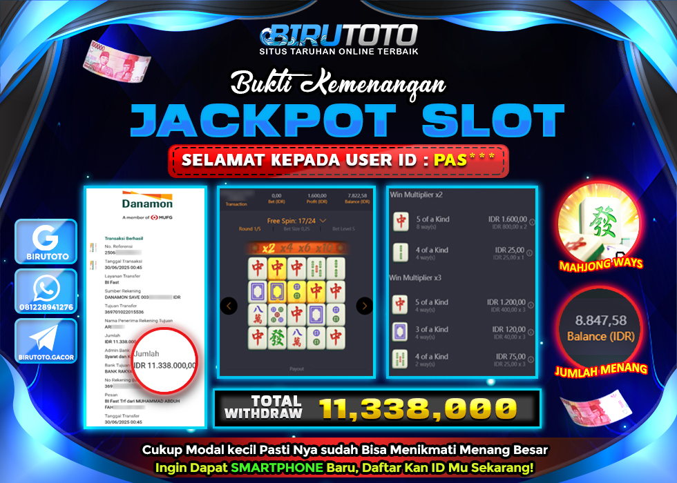BIRUTOTO JACKPOT SLOT MAHJONG WAYS Rp.11.338.000 LUNAS