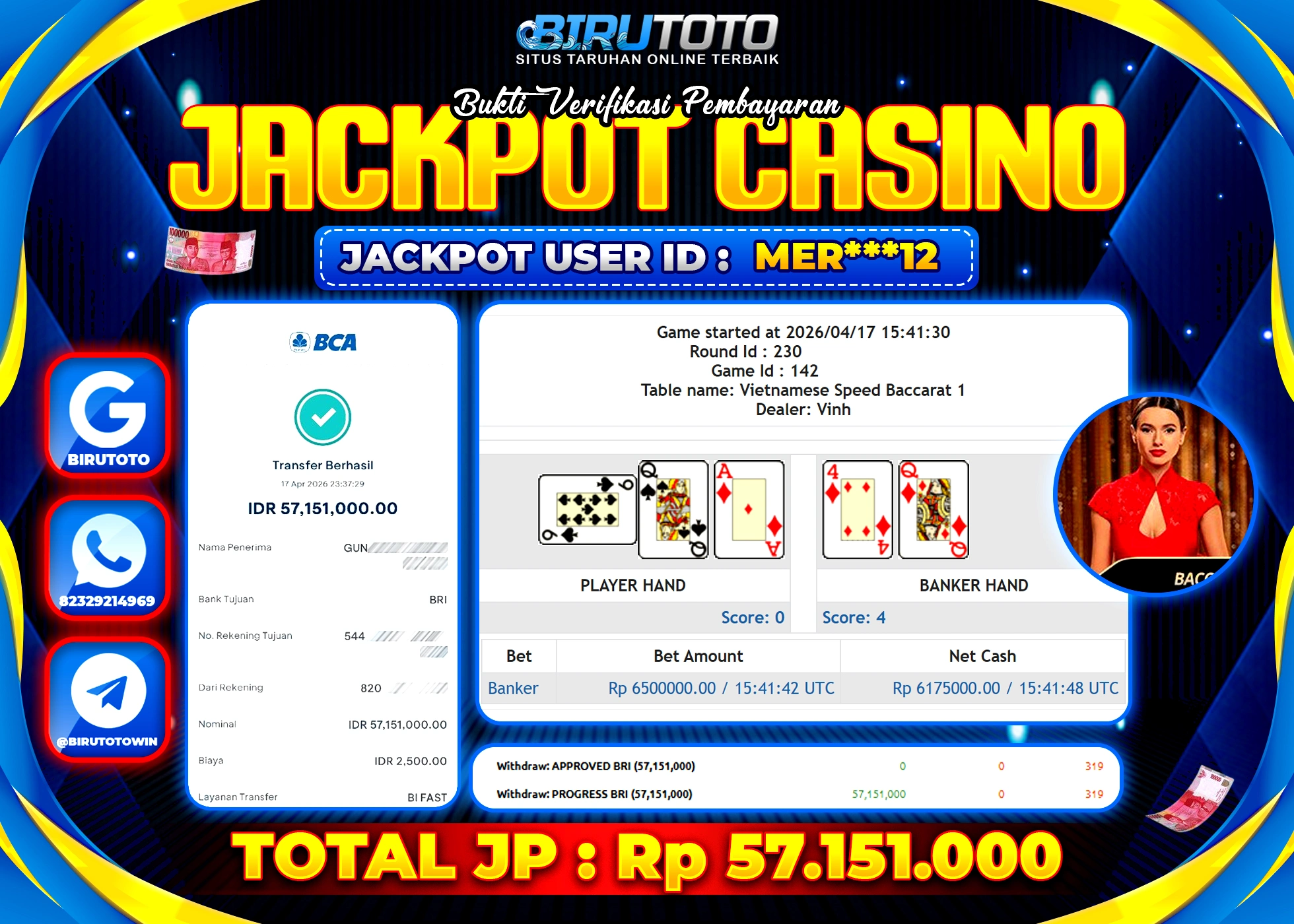 BIRUTOTO JACKPOT LIVE CASINO BACCARAT Rp.57.151.000 LUNAS