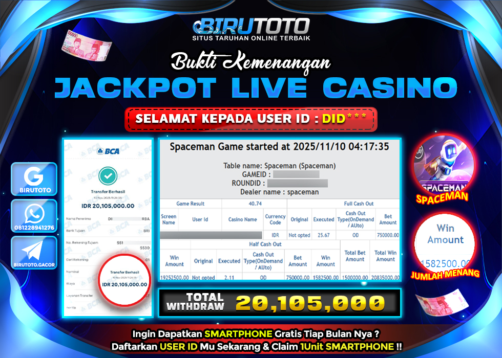 BIRUTOTO JACKPOT LIVE CASINO SPACEMAN Rp.20.105.000 LUNAS