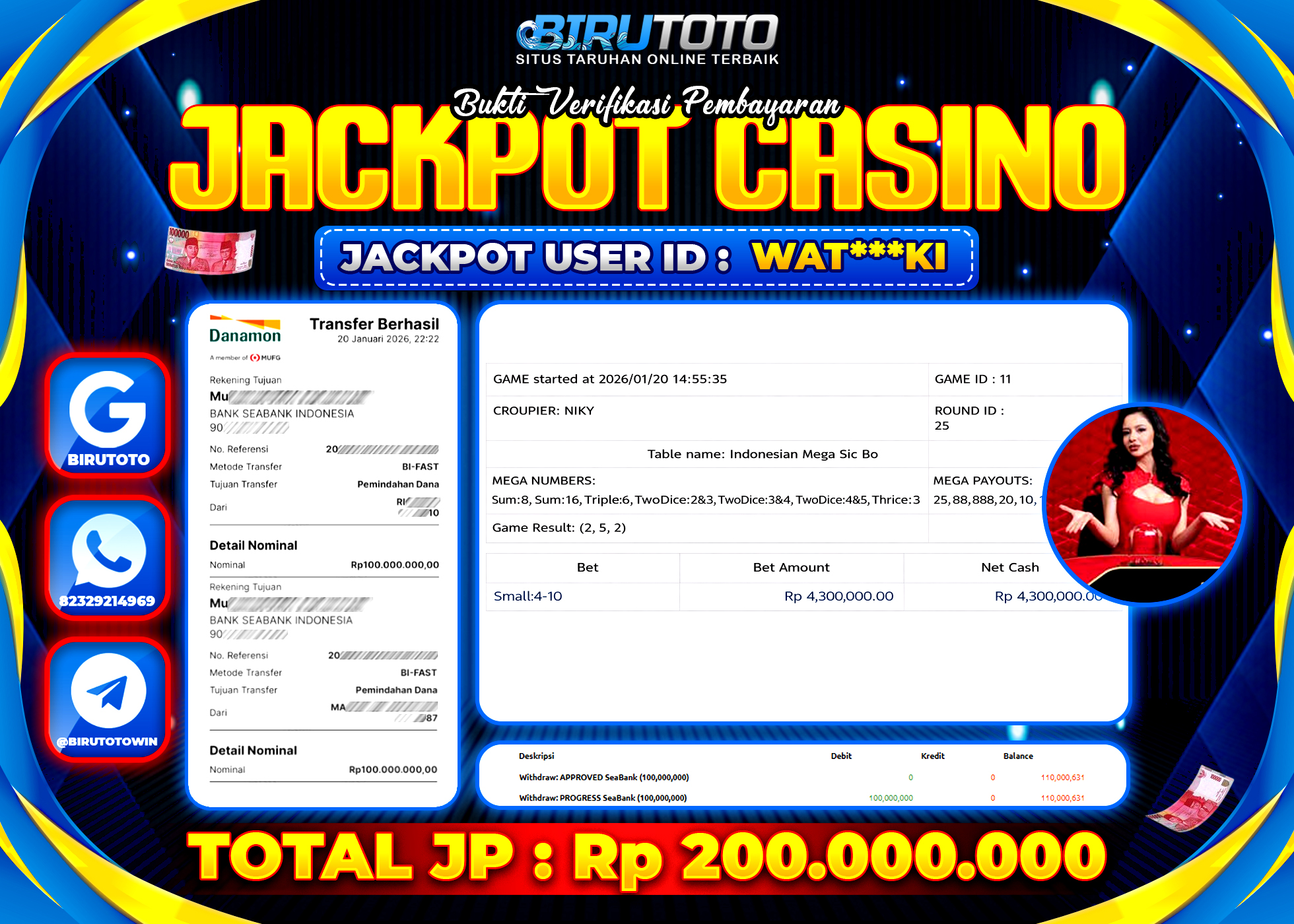 BIRUTOTO JACKPOT LIVE CASINO MEGA SICBO Rp.200.000.000 LUNAS