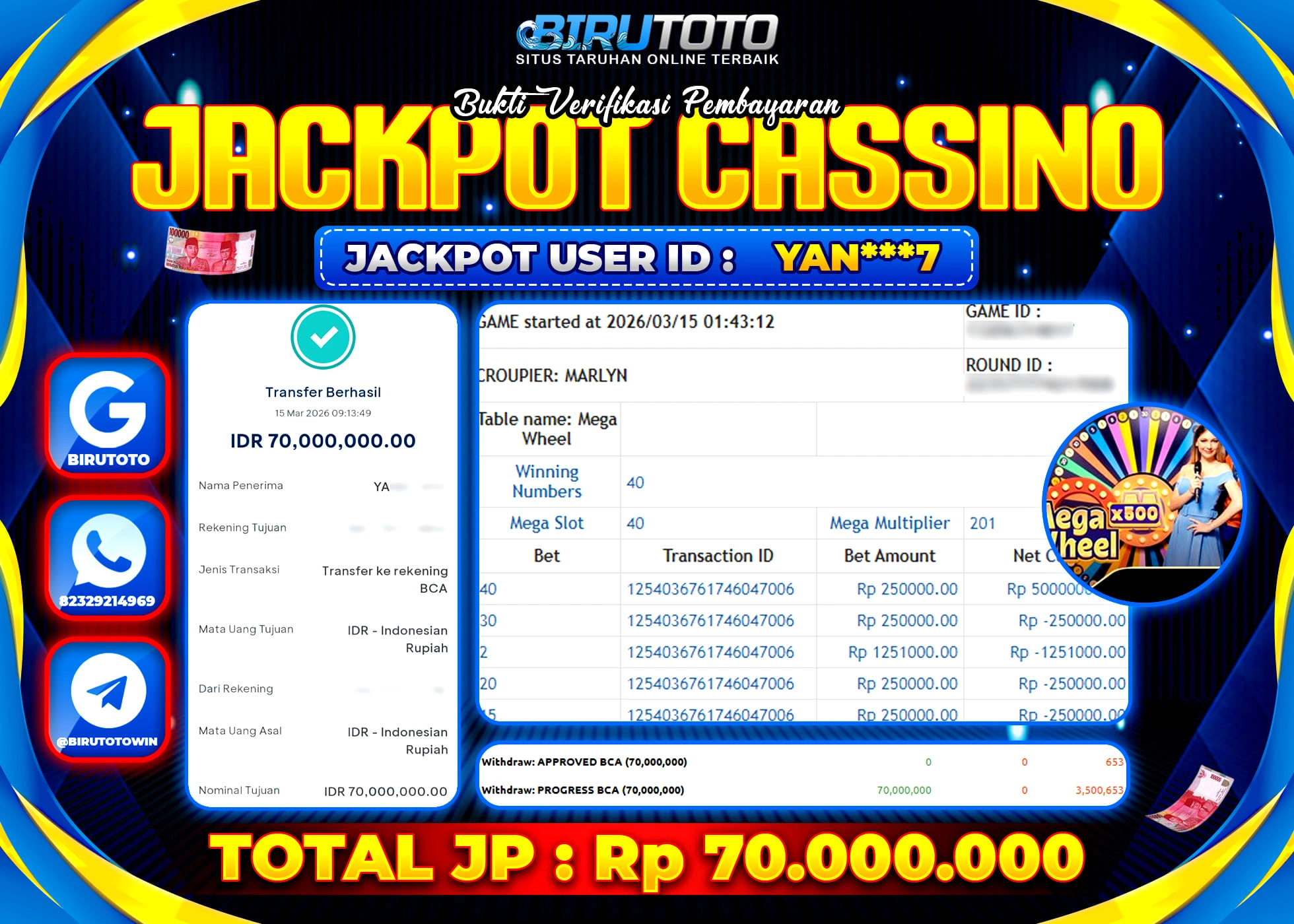 BIRUTOTO JACKPOT LIVE CASINO MEGA WHEEL Rp.70.000.000 LUNAS