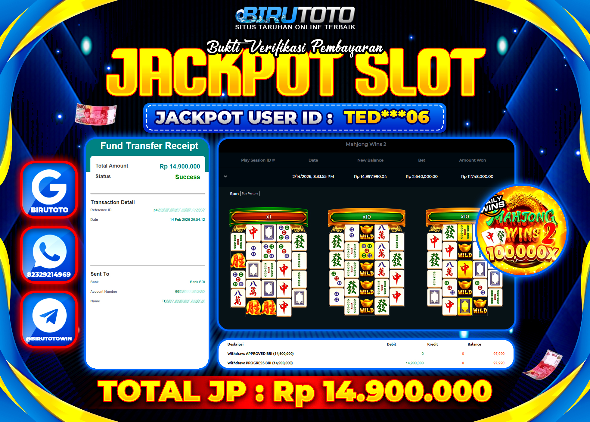 BIRUTOTO JACKPOT SLOT MAHJONG WINS 2 Rp.14.900.000 LUNAS
