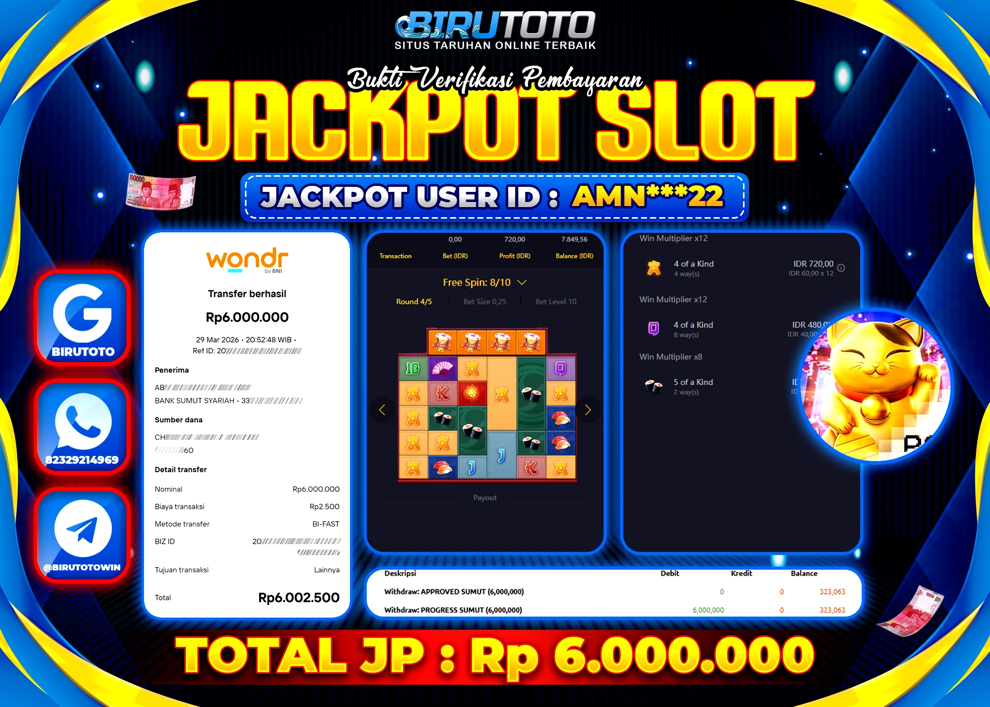 BIRUTOTO JACKPOT SLOT LUCKY NEKO Rp.6.000.000 LUNAS