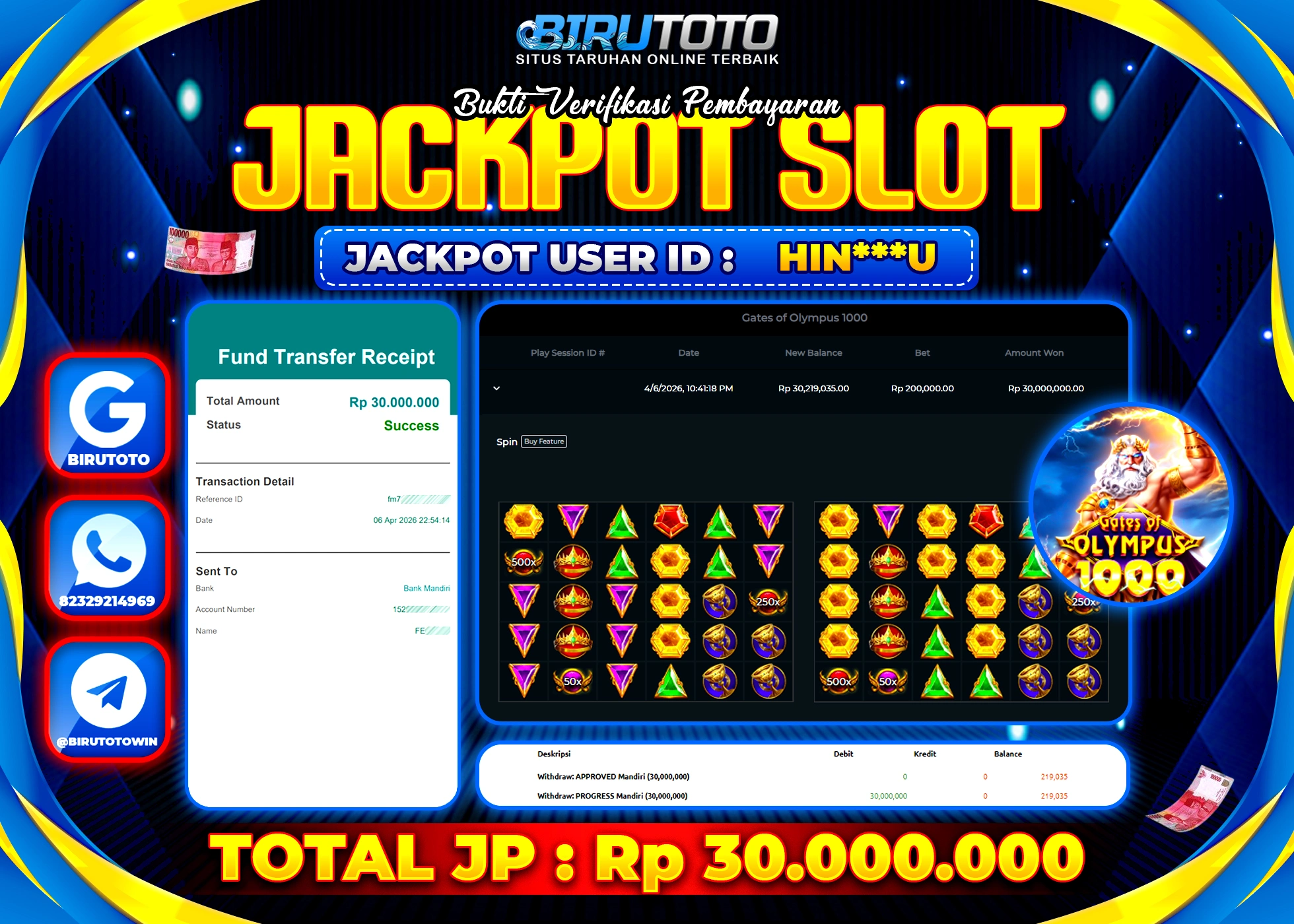 BIRUTOTO JACKPOT SLOT GATES OF OLYMPUS 1000 Rp.30.000.000 LUNAS