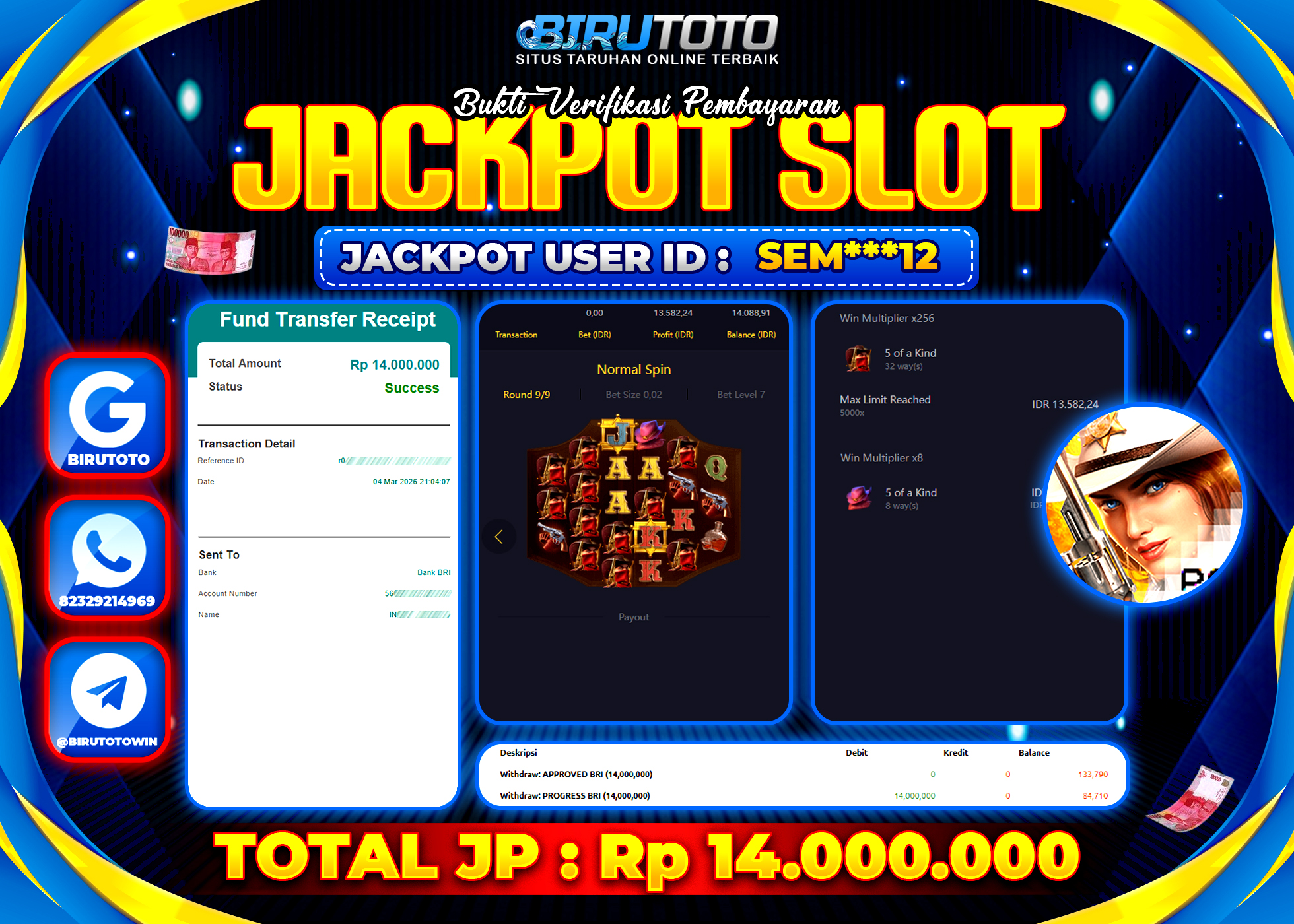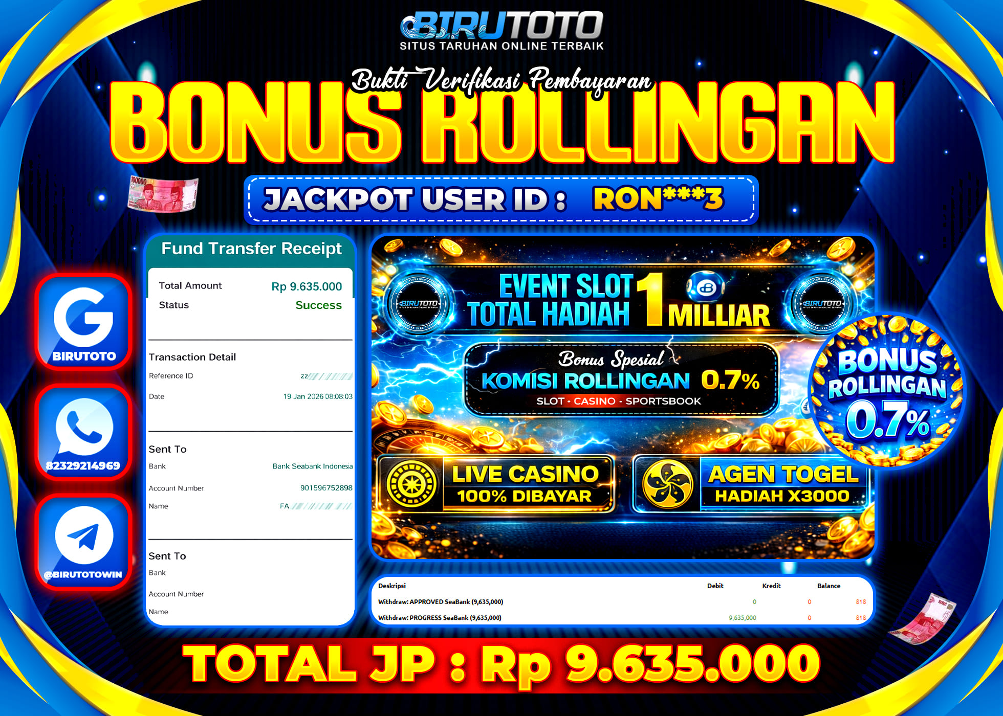 BIRUTOTO JACKPOT BONUS ROLLINGAN Rp.9.635.000 LUNAS