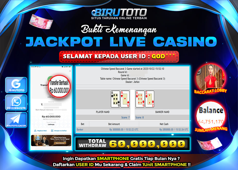 BIRUTOTO JACKPOT LIVE CASINO BACCARAT Rp.60.000.000 LUNAS
