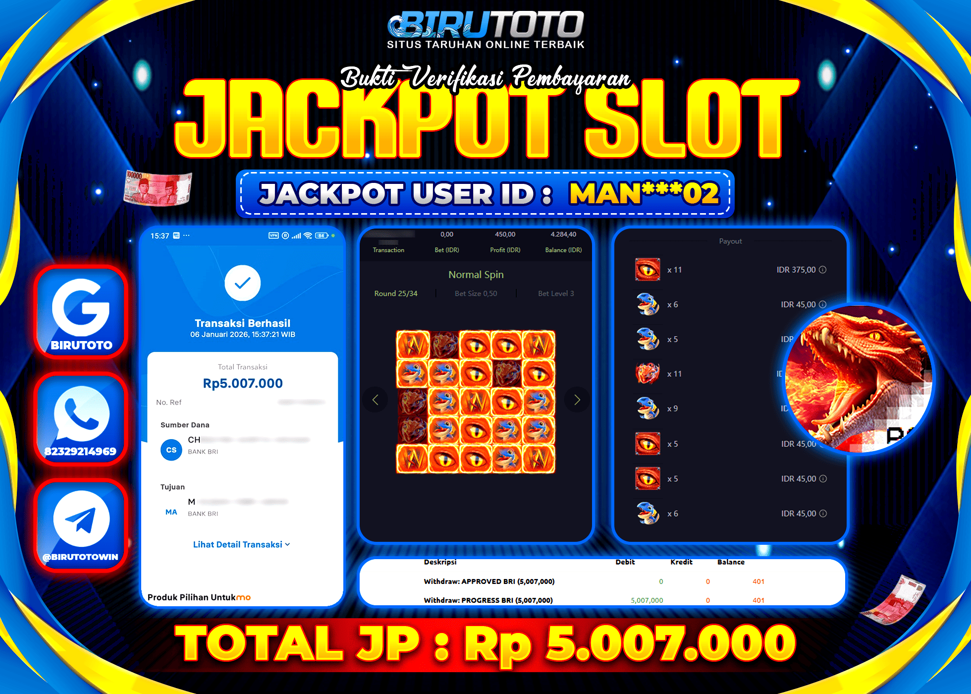 BIRUTOTO JACKPOT SLOT DRAGON HATCH 2 Rp.5.007.000 LUNAS
