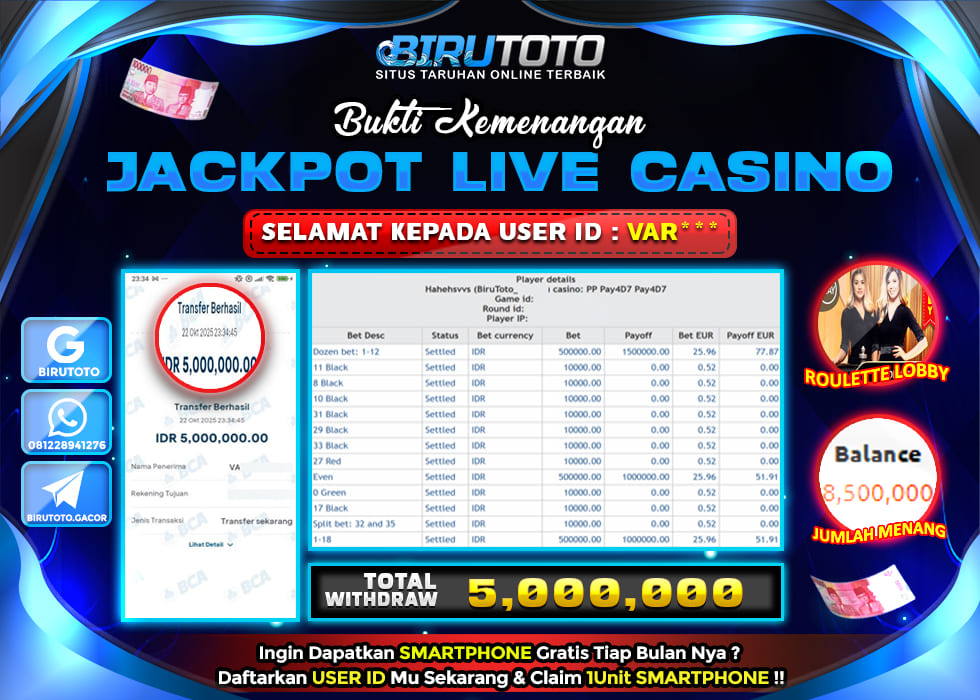 BIRUTOTO JACKPOT LIVE CASINO ROULETTE Rp.5.000.000 LUNAS