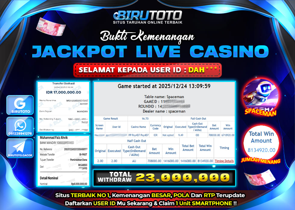 BIRUTOTO JACKPOT LIVE CASINO SPACEMAN Rp.23.000.000 LUNAS