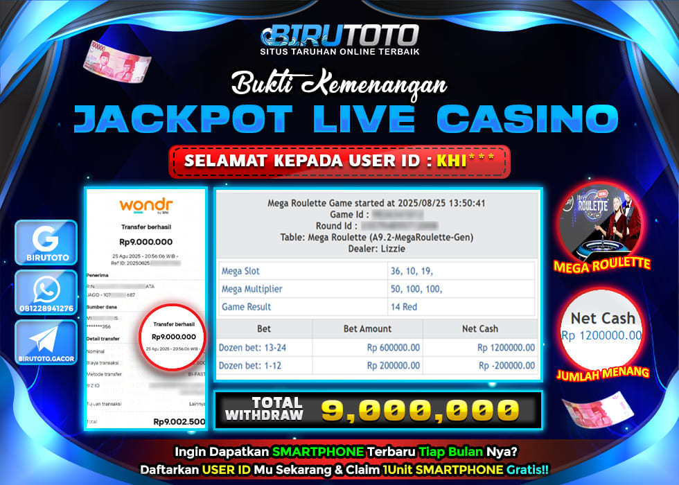 BIRUTOTO JACKPOT LIVE CASINO MEGA ROULETTE Rp.9.000.000 LUNAS