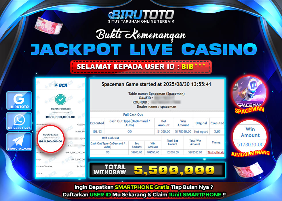 BIRUTOTO JACKPOT LIVE CASINO SPACEMAN Rp.5.500.000 LUNAS