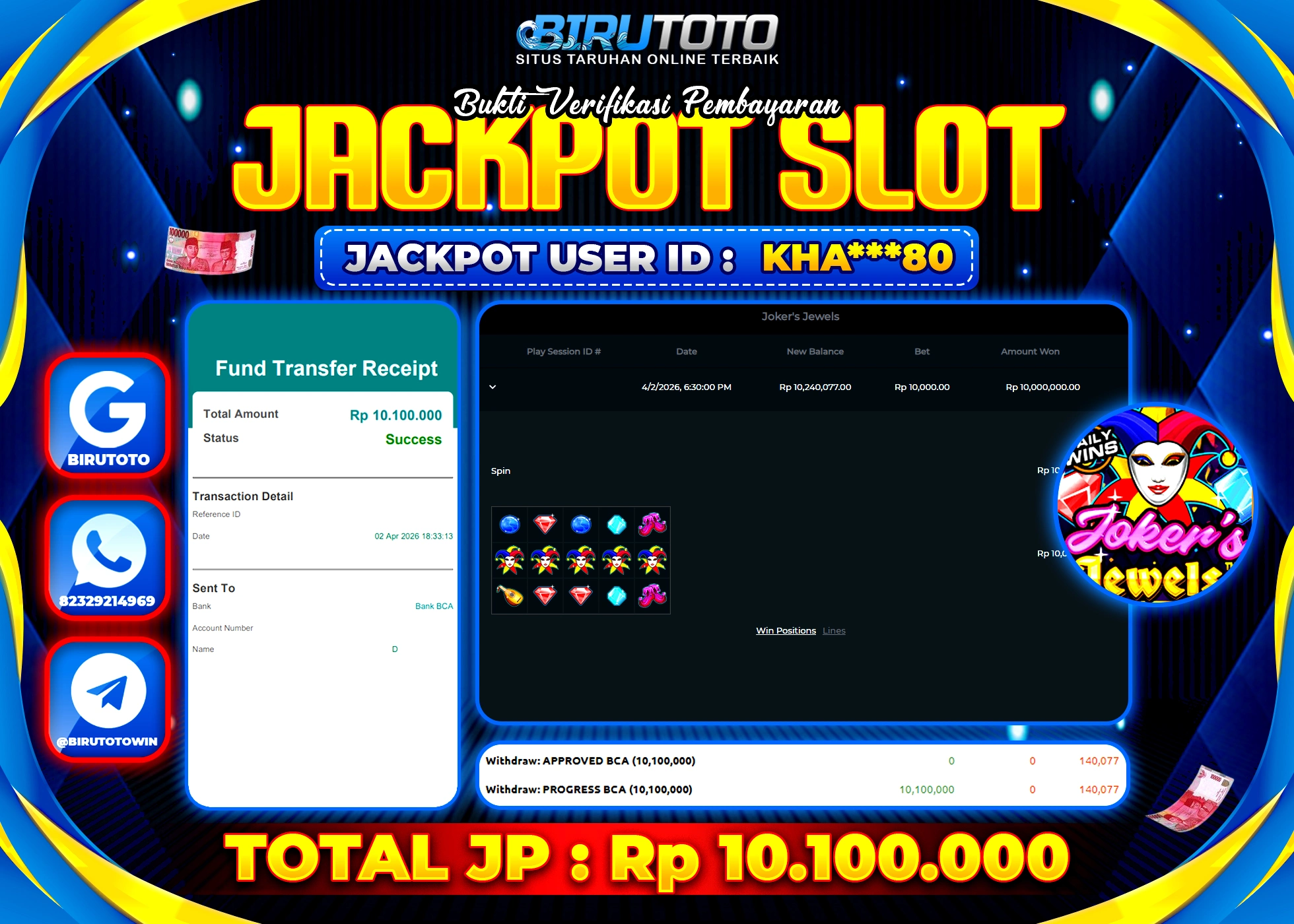 BIRUTOTO JACKPOT SLOT JOKER JEWELS Rp.10.100.000 LUNAS